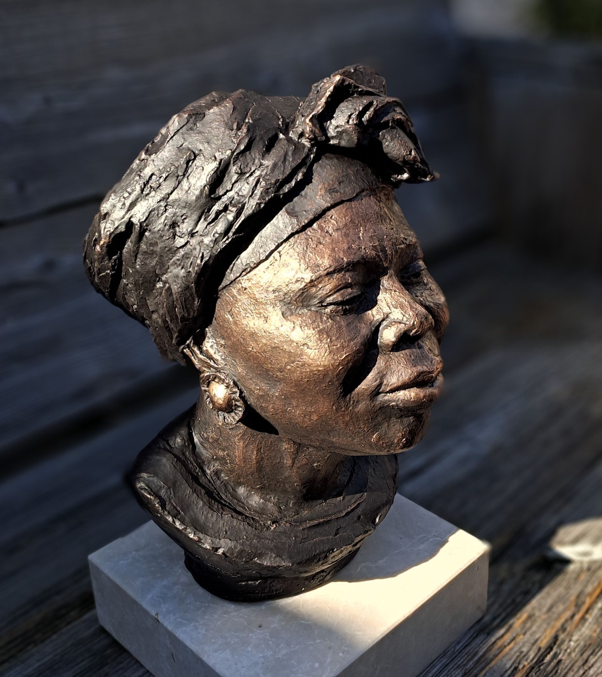 vrouwenkop in klei, heel herkenbaar. Mooi!''